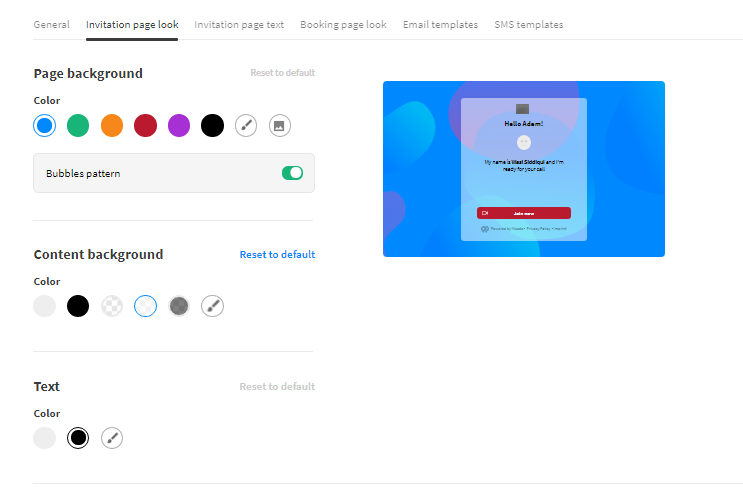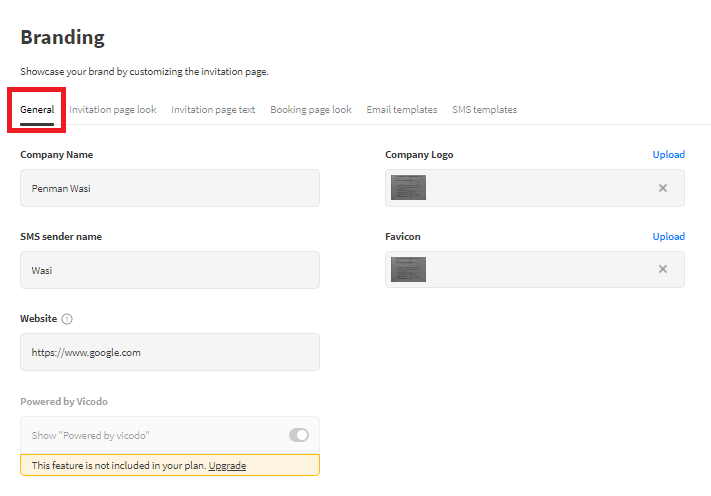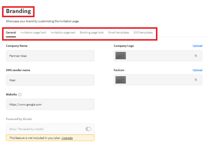 The branding section is sub-divided into 6 sub-sections: General, Invitation page look, Invitation page text, Booking page look, Email templates, and SMS templates. But here, the first three subsections will be discussed in detail.