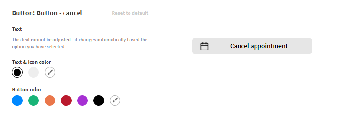 - Button: Button - Cancel: Click this button to cancel any appointment. You cannot change the text of this button because it automatically changes based on the options you select. But, you can change icons, text, and button colors.