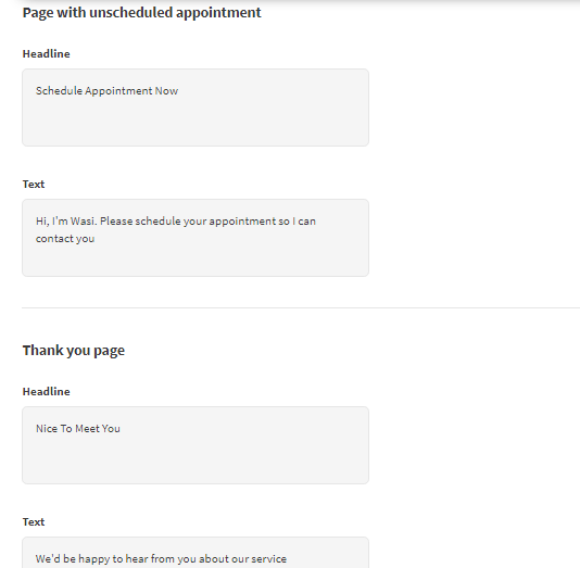 - Page with Unscheduled Appointment: Here the “Headline” and “Text” section does the same function as the schedule appointment section.